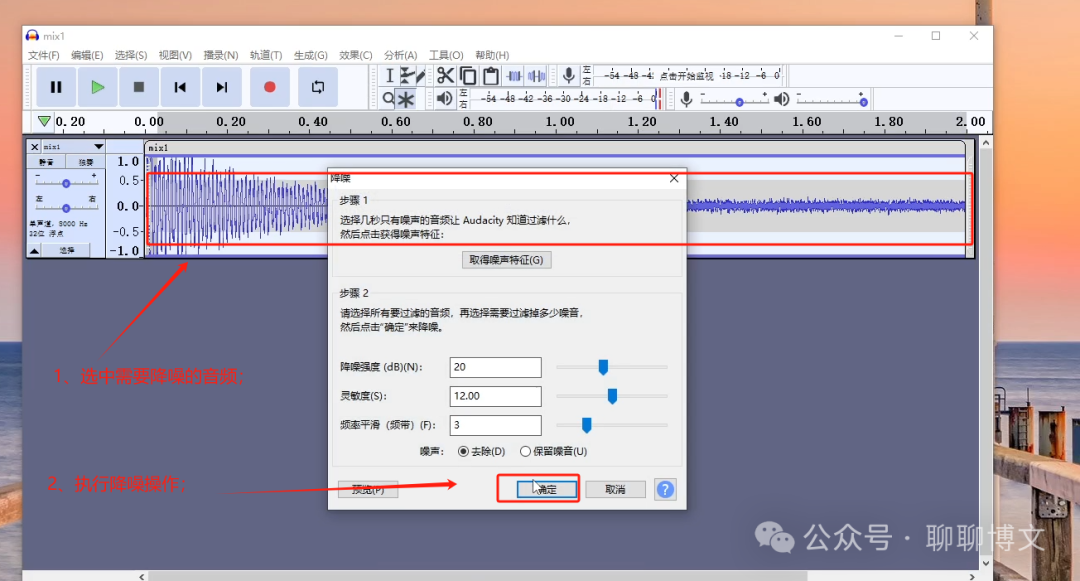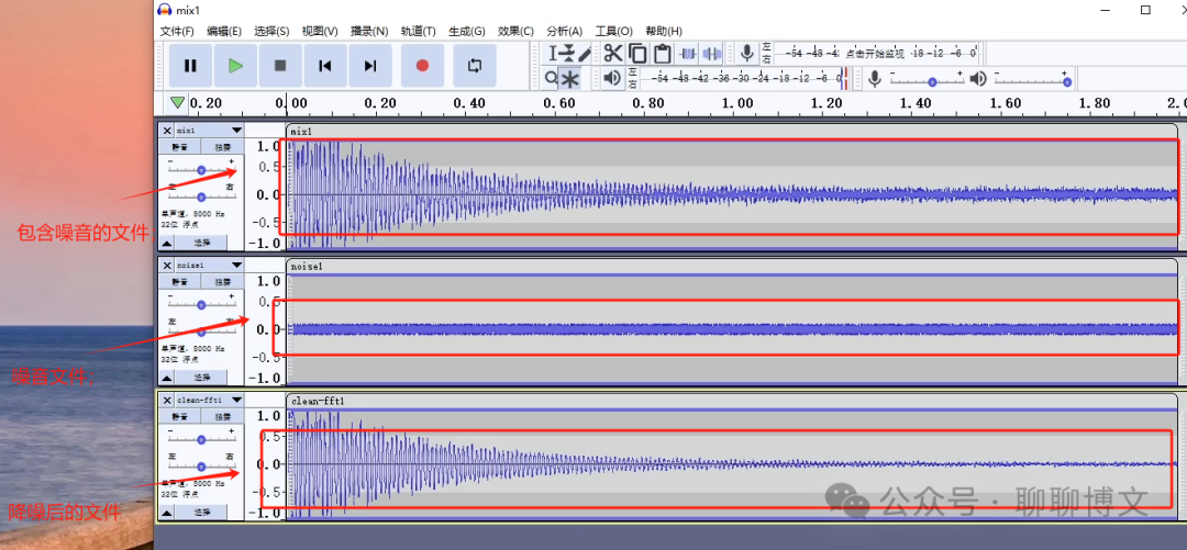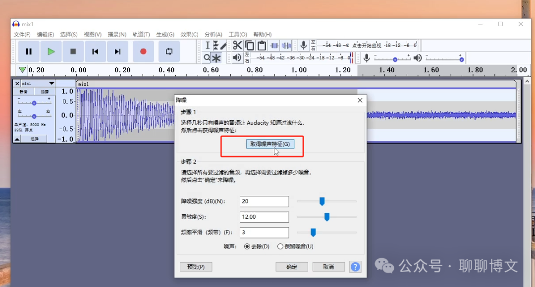 Audacity的降噪算法需要两个输入:1) 带噪音的音频数据;2) 噪音特征音频数据;
