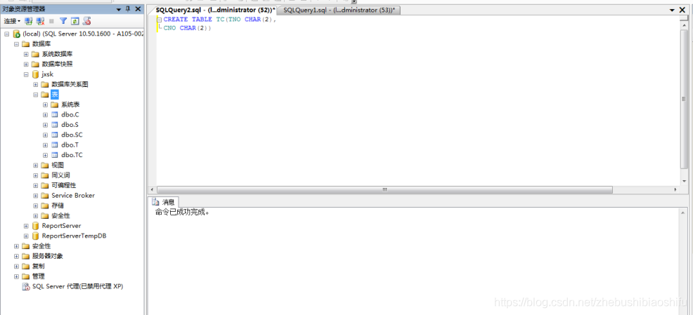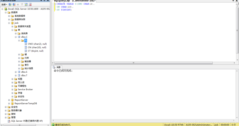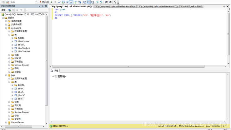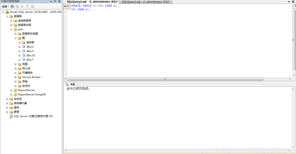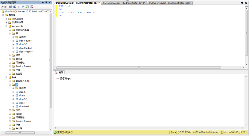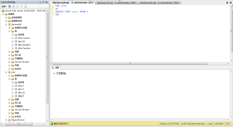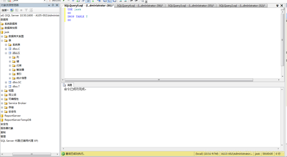 (2) 将jxsk设置为当前数据库,单击 “工具栏”中的“执行(x)”按钮,即可执行上述T-SQL语句,如下图;