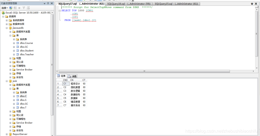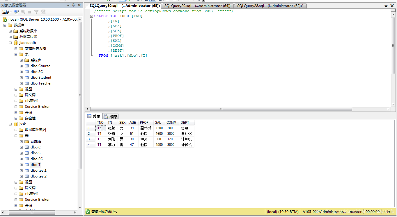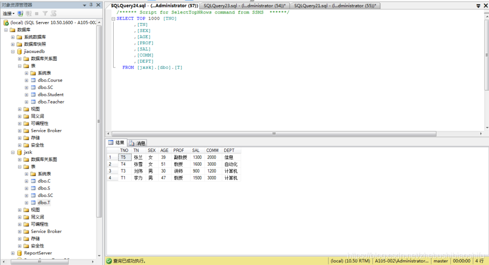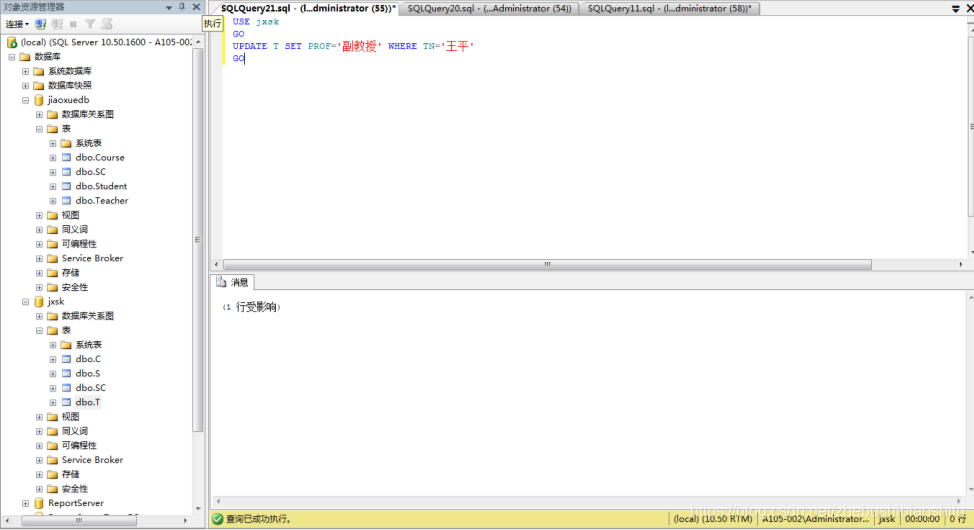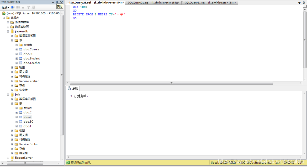 (2) 将jxsk设置为当前数据库,单击 “工具栏”中的“执行(x)”按钮,即可执行上述T-SQL语句,如下图;