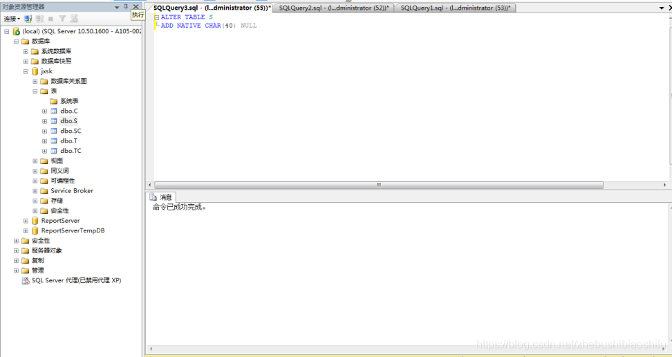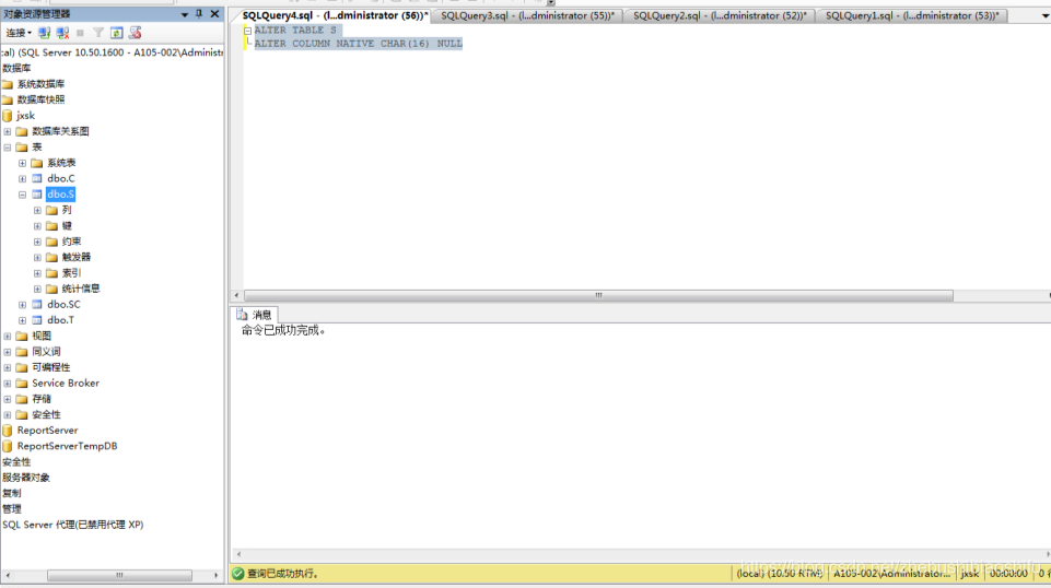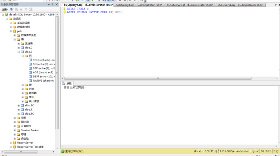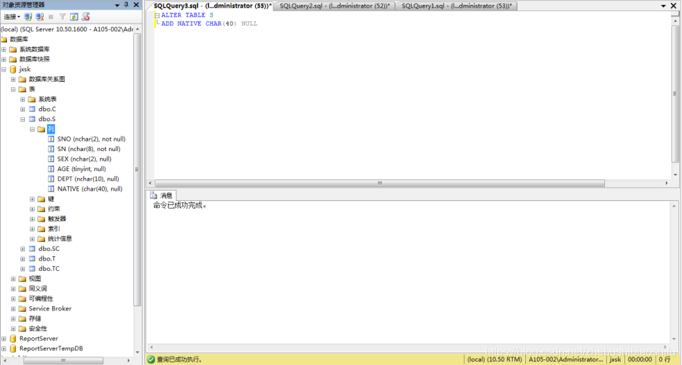 (3) 将jxsk设置为当前数据库,单击 “工具栏”中的“执行(x)”按钮,即可执行上述T-SQL语句,如下图;