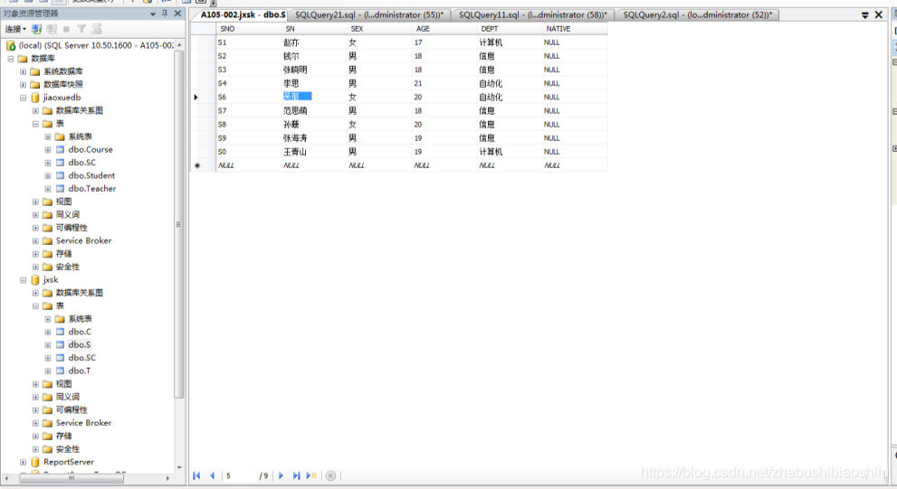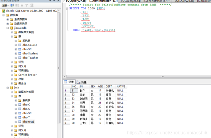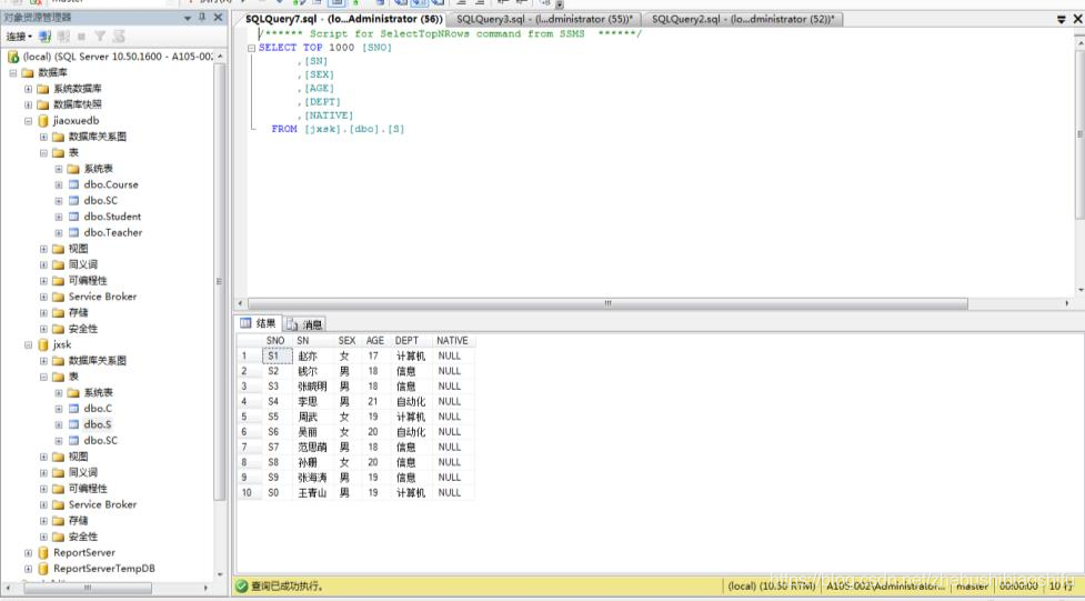 (7) 在“对象资源管理器”窗格中,选择“数据库”→“jxsk”→“表”并右击表S,在弹出的菜单中选择“选择前1000行”可查看表中内容,如下图。
