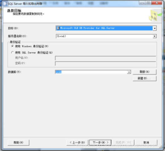 (5) 选择“下一步”按钮,打开“选择目标”窗口,设置导入目标数据库各选项,并正确配置各选项,如以下图;