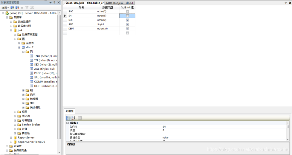 (3) 在“对象资源管理器”窗格中,选择“数据库”→“jxsk”→“表”,可看到数据库表test1已存在,如下图;