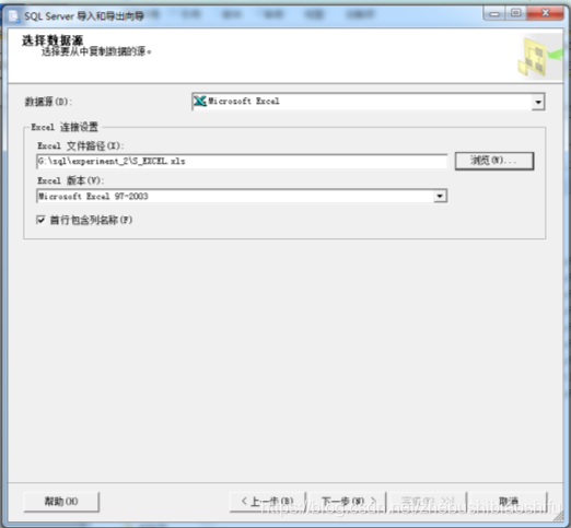 (4) 在“Excel版本”一栏下拉列表中,选择 Microsoft Excel 97-2003;选择“首行包含列名称”复选框;