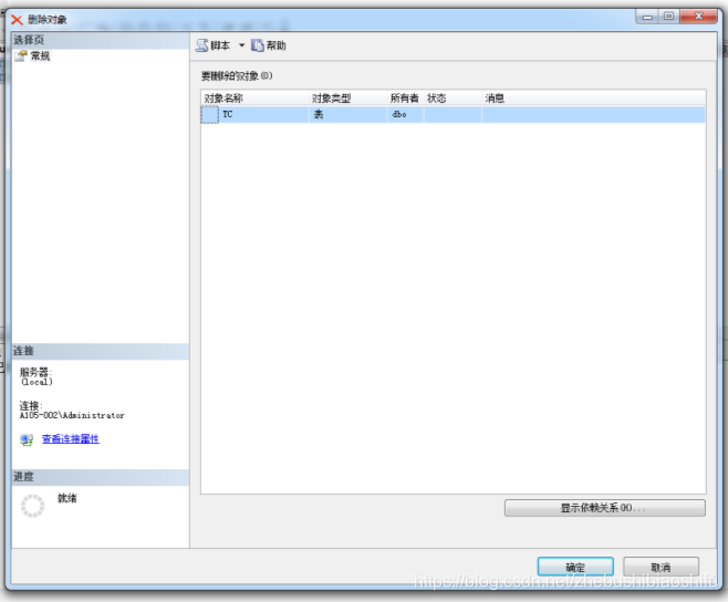 (2) 可以发现在“删除对象”列表中存在待删除的数据库表TC,单击“确定”按钮,完成删除数据库表TC操作,如下图;