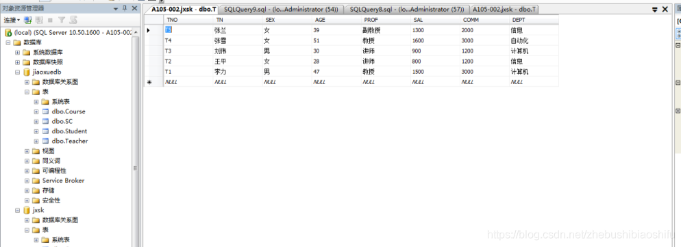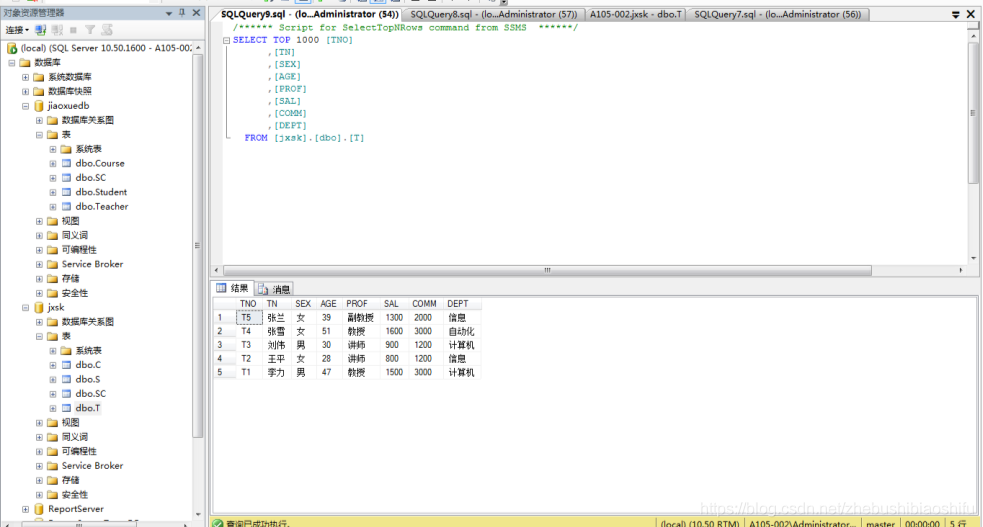 (4) 在“对象资源管理器”窗格中,选择“数据库”→“jxsk”→“表”并右击表T,在弹出的菜单中选择“选择前1000行”可查看表T中内容已对应改变。