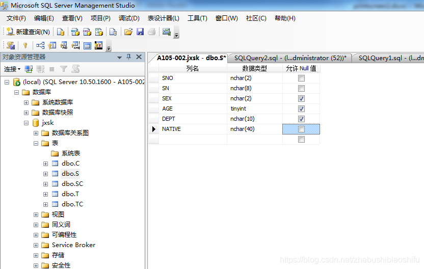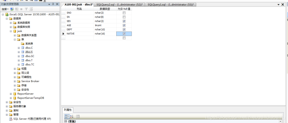 (3) 在“对象资源管理器”窗格中,在“数据库”→“jxsk”→“表”→“odb.S”→“列”处右键,在弹出的菜单中选择“刷新”选项,可见其所示内容中通过上述方法新建立的列NATIVE的定义已被修改,如下图;