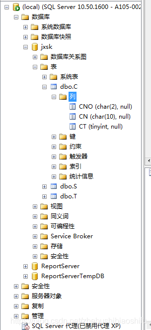 (3) 在“对象资源管理器”窗格中,在“数据库”→“jxsk”→“表”处右键,在弹出的菜单中选择“刷新”选项,可见其所示内容中已存在通过上述方法新建立的数据库表C,如下图;