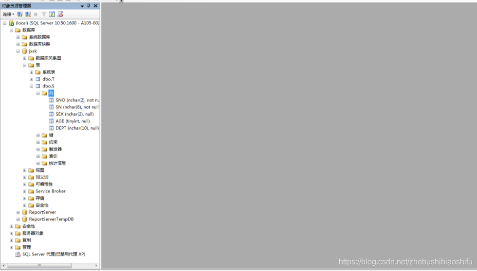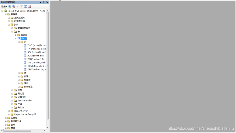 (3) 在“对象资源管理器”窗格中,在“数据库”→“jxsk”→“表”处右键,在弹出的菜单中选择“刷新”选项,可见其所示内容中已不存在数据库表T,如下图;