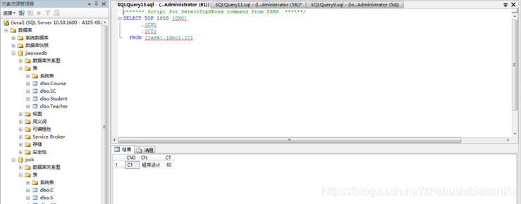 (3) 在“对象资源管理器”窗格中,在“数据库”→“jxsk”→“表”→“odb.C”处右键,在弹出的菜单中选择“选择前1000行”选项,可见其所示内容中已存在通过上述方法新建立的课程记录,如下图;