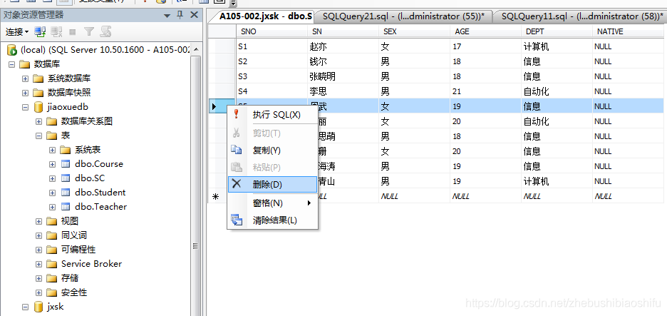 (1) 在“对象资源管理器”窗格中,选择“数据库”→“jxsk”→“表”,右击“dbo.TC”,在弹出的菜单中选择“删除”;