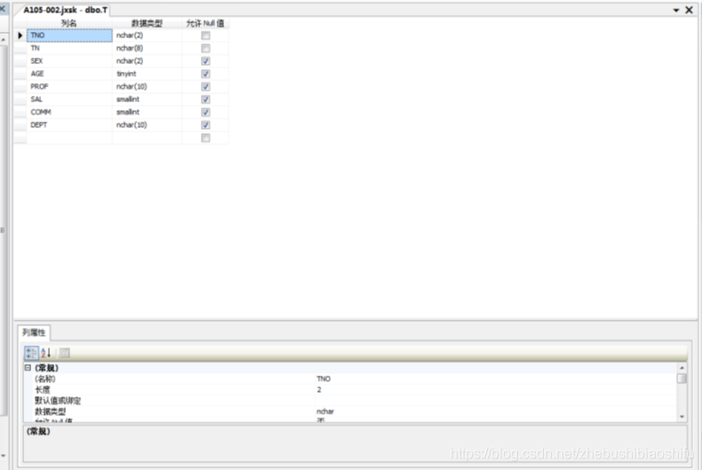 (5) 依照《SQL Server实验指导(2005版)》“教师表T”中内容,输入各字段定义;单击工具栏中的保存按钮,在弹出的“选择名称”对话框中输入表名称“T”;点击“确定”;
