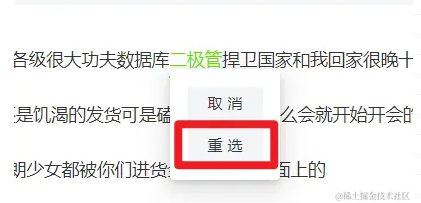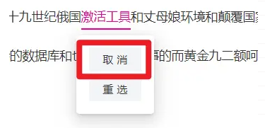 点击已进行标记的文字————>重选/取消弹窗显示————>点击取消