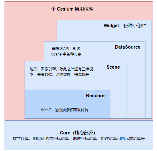 - 性能:缓存、最小化 WebGL 的调用全部集中在渲染器内,使得 Cesium 在其他地方调用的时候能获得不错的性能。