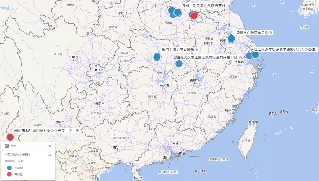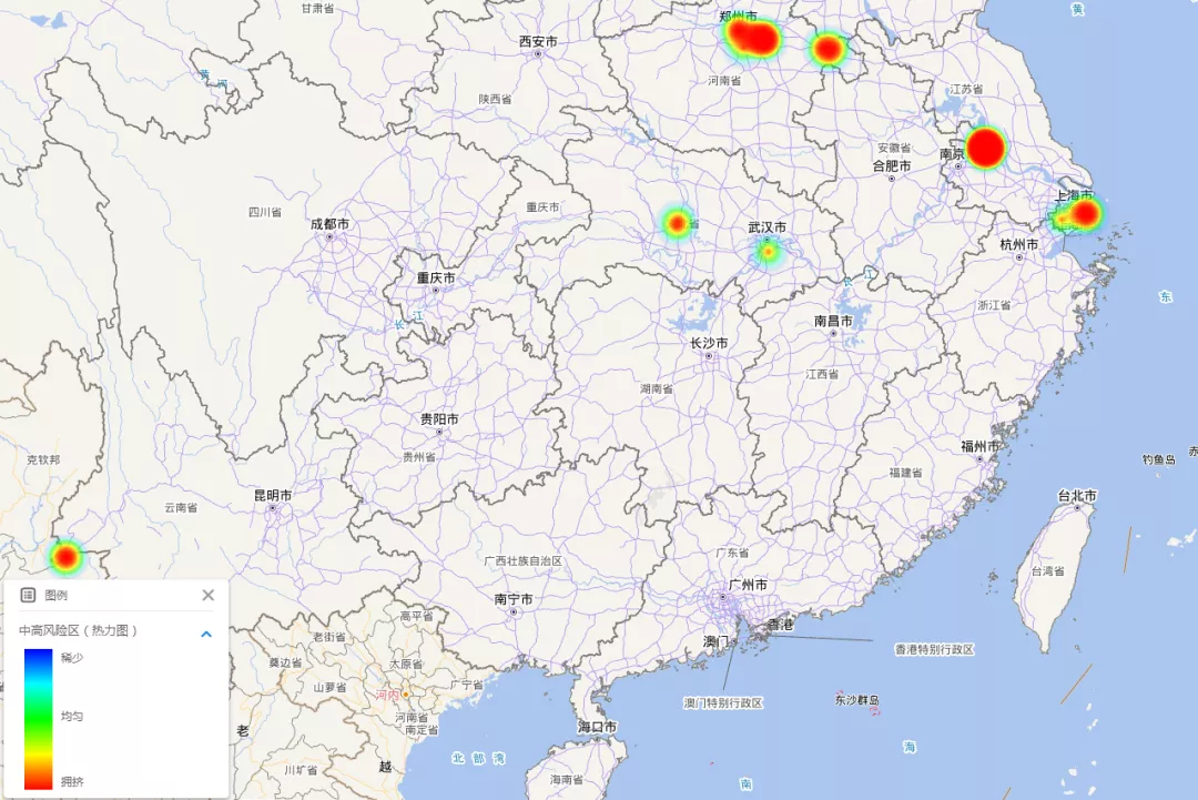 本示例分别制作了“单值专题图”和“热力图”。在单值专题图中,选择风险级别为专题字段,红色表示高风险地区,蓝色表示中风险地区。热力图则较好的展示了中高风险区较为集中的区域。