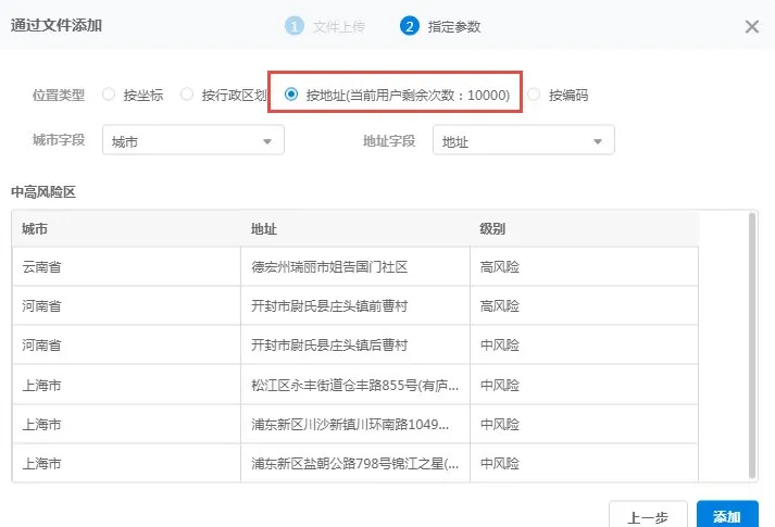 点击“立即体验”打开数据上图。选择“上传文件”,数据上图支持上传CSV、Excel、GeoJSON和压缩成.Zip的Shapefile格式的文件。本示例使用的是“20210825全国中高风险地区名单.xlsx”文件,复制下方百度云链接即可获取。在参数选择步骤,选择“按地址”,即可将无坐标的数据在地图上展示。