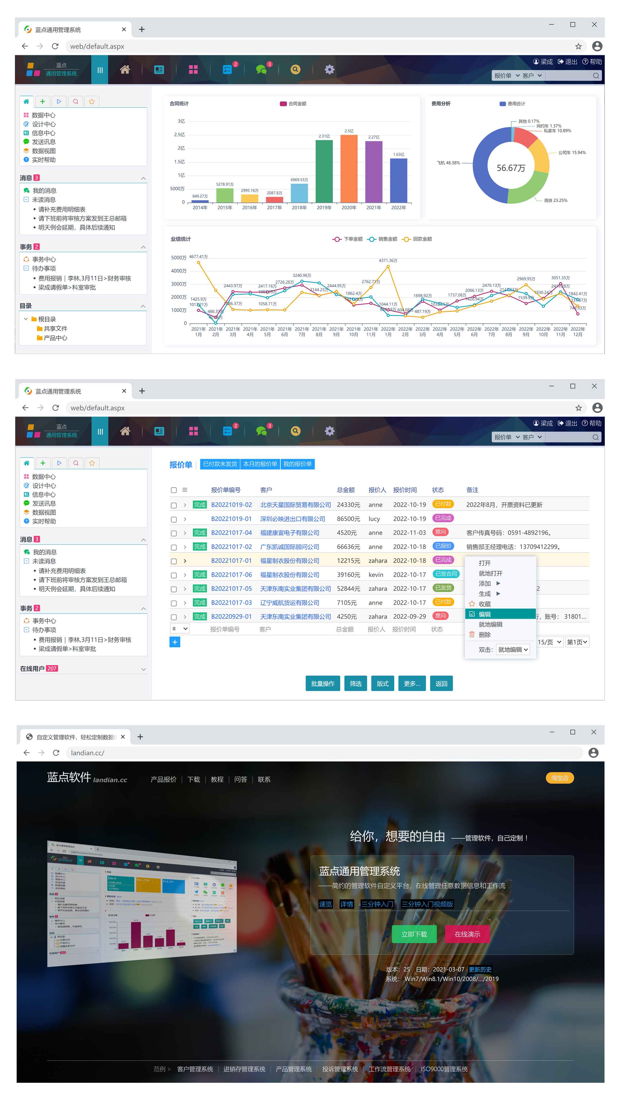 系统可以安装在单机、局域网或互联网云服务器/虚拟主机上,随时随地用电脑或手机操作,兼容多种设备、数据库和浏览器,具备条码/二维码、微信公众号接入、微信查询数据和拍照上传、来电弹屏、Web API接口等诸多好用功能,可轻松搭建起比定制软件更好的管理系统,并能自由扩展,作为综合性管理系统。