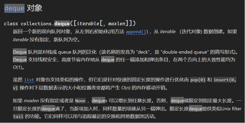 以下是关于双端队列相关操作的示例代码,首先我们需要导入 collections 模块,这个模块实现了一些专门化的容器,提供了对 Python 的通用内建容器 dict、list、set 和 tuple 的补充: