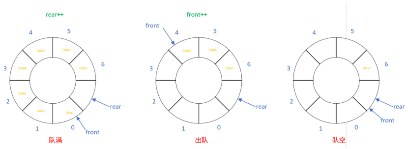 在一个普通队列里,一旦一个队列满了,我们就不能插入下一个元素,即使在队列前面仍有空间。这时,我们可以利用循环队列实现利用这个队列之前用过的空间,通过循环队列我们能使用这些空间去存储新的值。循环队列是一种线性数据结构,其操作表现基于 FIFO(先进先出)原则并且队尾被连接在队首之后以形成一个循环。它也被称为“环形缓冲器”。