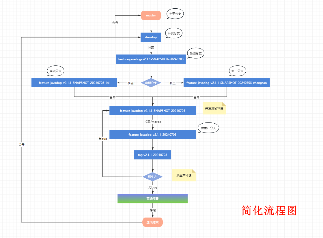 张三开发的模块A功能完成,本地调试正常后,将自己临时分支合并到功能分支,流水线由测试小姐姐打包功能分支feature-javadog-v2.1.1-SNAPSHOT-20240703