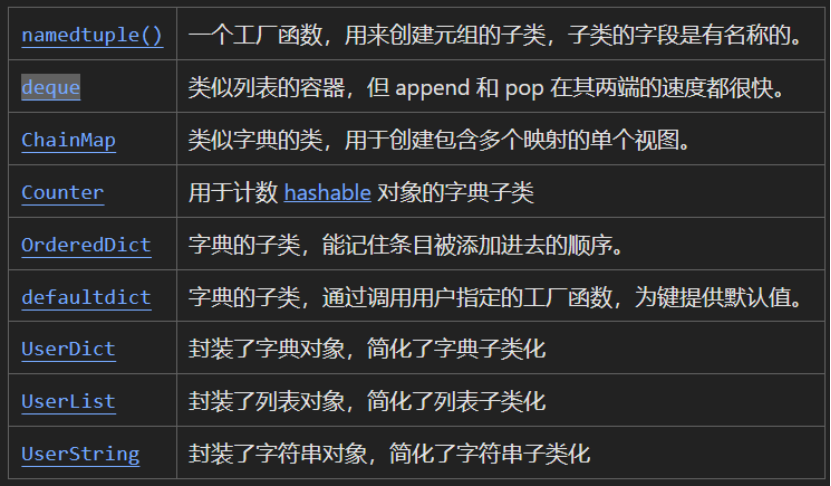 Python 内置的数据类型和方法,collections 模块在这些内置类型的基础提供了额外的高性能数据类型,比如基础的字典是不支持顺序的,collections 模块的 OrderedDict 类构建的字典可以支持顺序,collections 模块的这些扩展的类用处非常大,熟练掌握该模块,可以大大简化 Python 代码,提高 Python 代码逼格和运行效率。