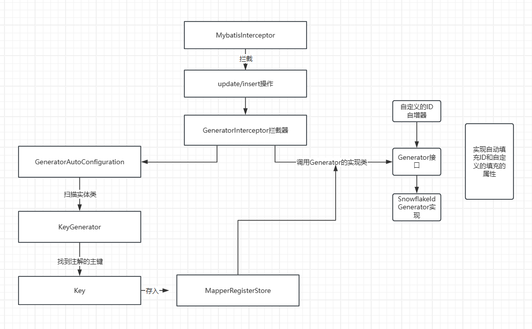 GeneratorInterceptor实现了Mybatis的拦截器,其拦截活动为update/insert,在Mybatis触发update/insert操作时进行ID增长和自定义的属性添加效果