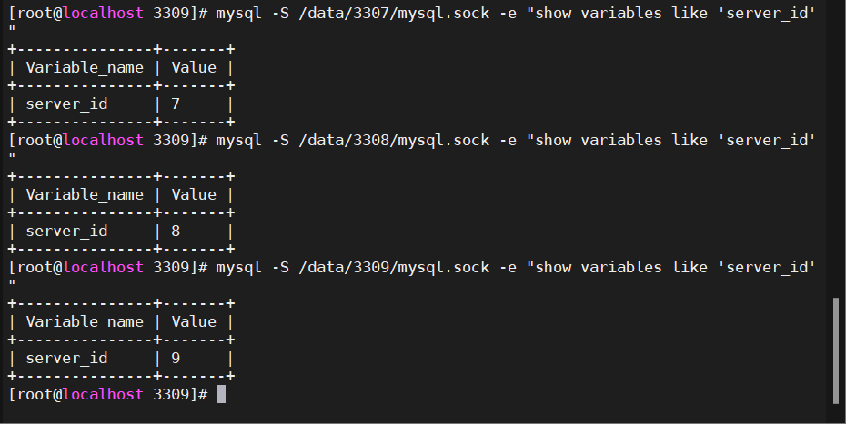 mysql -S /data/3309/mysql.sock -e "show variables like 'server_id'"