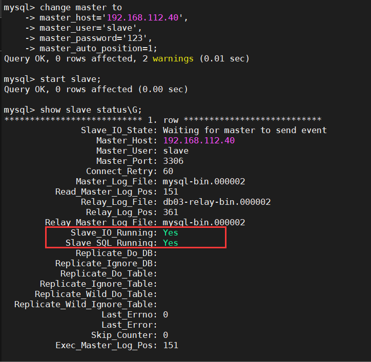 mysql> show slave status\G; #确保从库的IO和SQL线程开启Yes