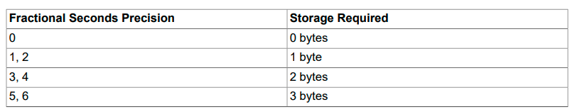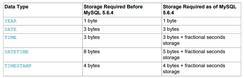 For TIME, DATETIME, and TIMESTAMP columns, the storage required for tables created before MySQL 5.6.4 differs from tables created from 5.6.4 on. This is due to a change in 5.6.4 that permits these types to have a fractional part, which requires from 0 to 3 bytes.