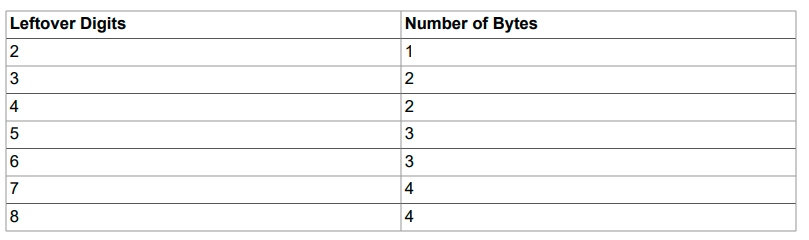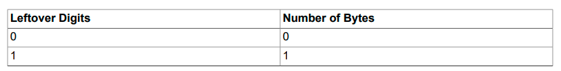 Values for DECIMAL (and NUMERIC) columns are represented using a binary format that packs nine decimal (base 10) digits into four bytes. Storage for the integer and fractional parts of each value are determined separately. Each multiple of nine digits requires four bytes, and the “leftover” digits require some fraction of four bytes. The storage required for excess digits is given by the following table.
