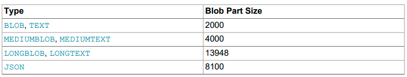 TEXT, BLOB, and JSON columns are implemented differently in the NDB storage engine, wherein【werˈɪn 其中;在那里;在那种情况下;以什么方式;】 each row in the column is made up of two separate parts. One of these is of fixed size (256 bytes for TEXT and BLOB, 4000 bytes for JSON), and is actually stored in the original table. The other consists of any data in excess of 256 bytes, which is stored in a hidden blob parts table. The size of the rows in this second table are determined by the exact type of the column, as shown in the following table: