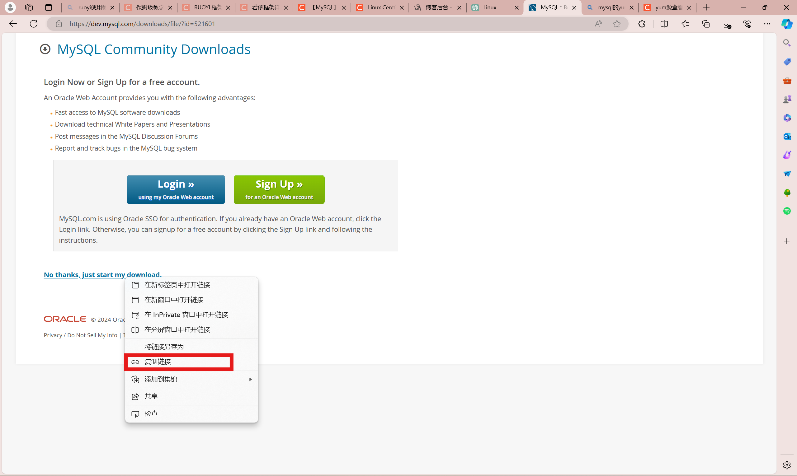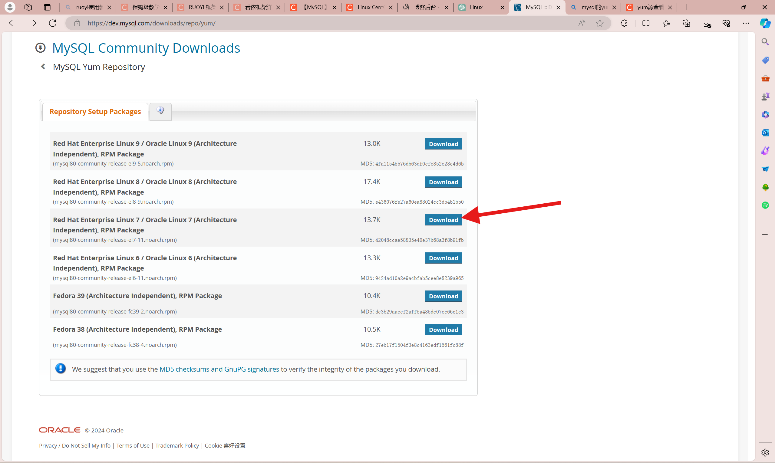 ①MySQL官方源网站获取yum源地址,具体步骤如下