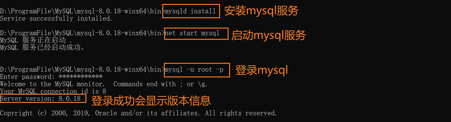 使用以下命令安装服务,如果安装了多个版本的mysql,服务名通常使用mysql+版本即可,服务名也可省略,默认会使用mysql