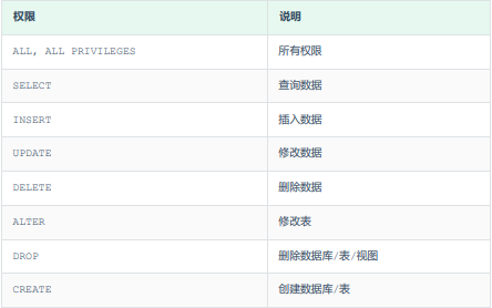 MySQL中定义了很多种权限,但是常用的就以下几种: