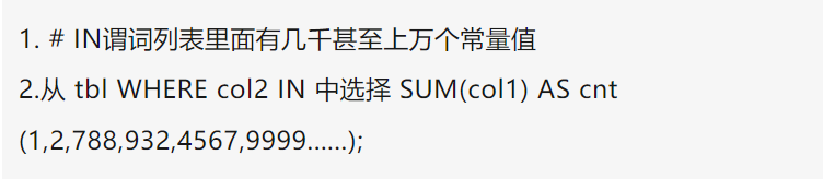 在生产环境中,经常会遇到客户业务的SQL语句进行过滤查询,然后进行聚合处理,并且IN谓词列表中包含几千甚至上万个常量值。如下所示,此类语句的执行时间非常长。