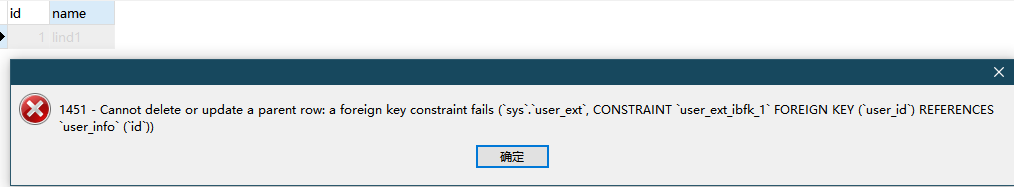 当删除主表数据(user_ext中已经存在引用的数据),会出现这个提示,不让你删除主表数据,要想删除,需要先删子表的才行