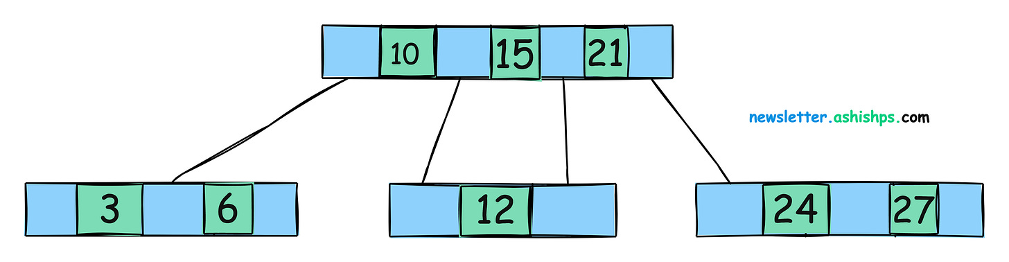 在 B+ 树中,所有数据值都仅存储在叶节点中,这可以进一步提高范围查询等某些用例的性能。