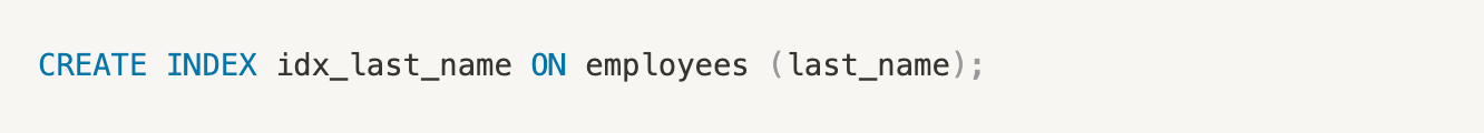 在本例中,我们使用语句在表上CREATE INDEX创建一个名为的索引。索引是在列上创建的。idx_last_name``employees``last_name