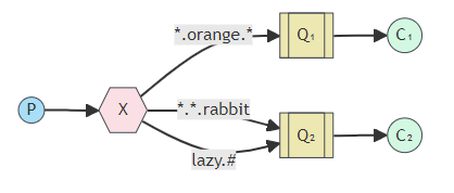 lazy.pink.rabbit"的消息的将仅被投放入Q2队列中,且只会放入一次,虽然匹配两个绑定键。 -