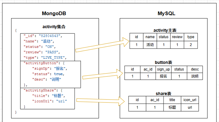 但这样的结构在 MySQL 里是不能实现的,理由很简单,MySQL 强调关系,1:1 和 1:N 是十分常见的关系。可以看到,下面将基本属性放在 activity 作为主表,而其它额外属性分别放在了 button 表和 share 表里,同时将主表的主键 id 作为了关联表的 ac_id 外键。