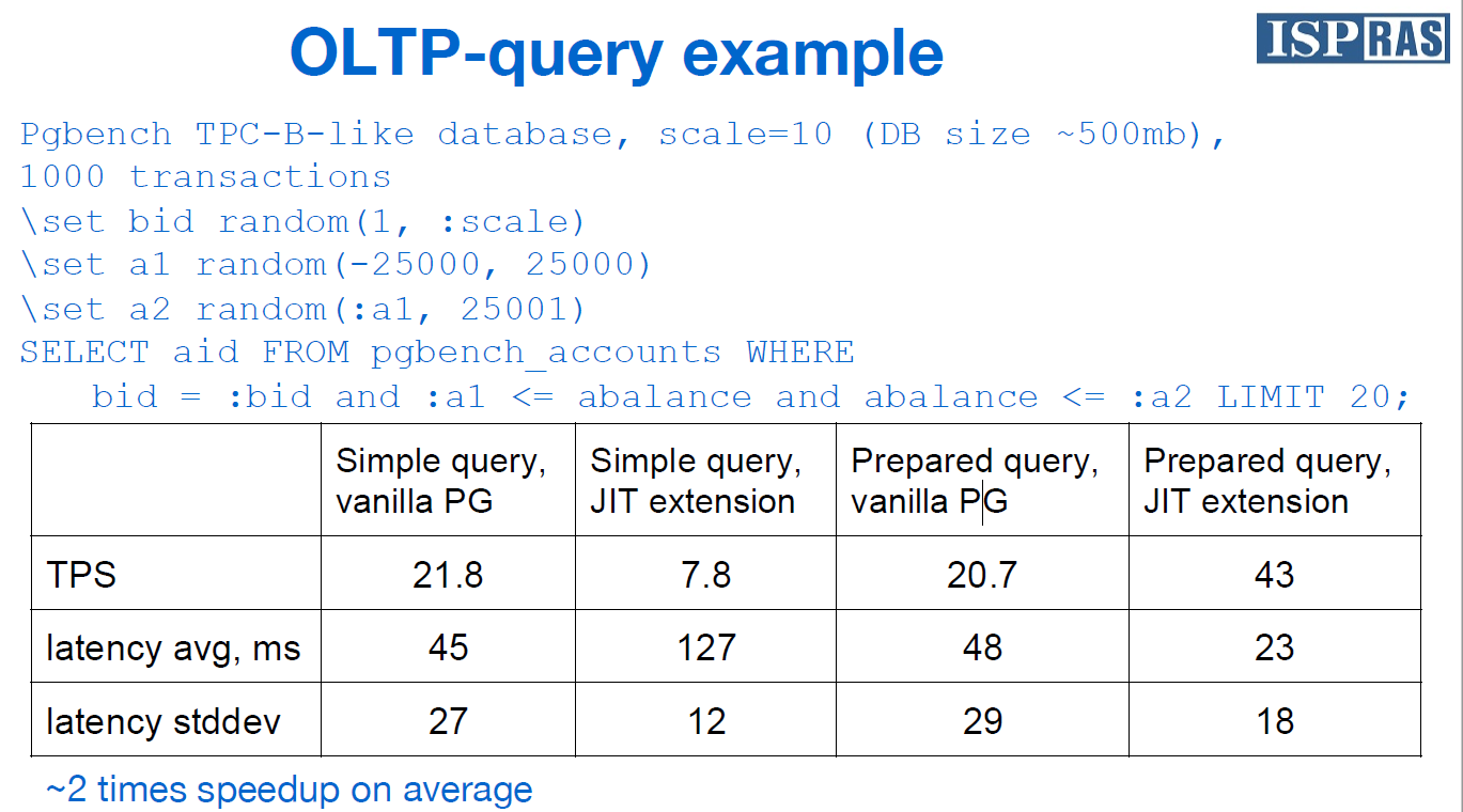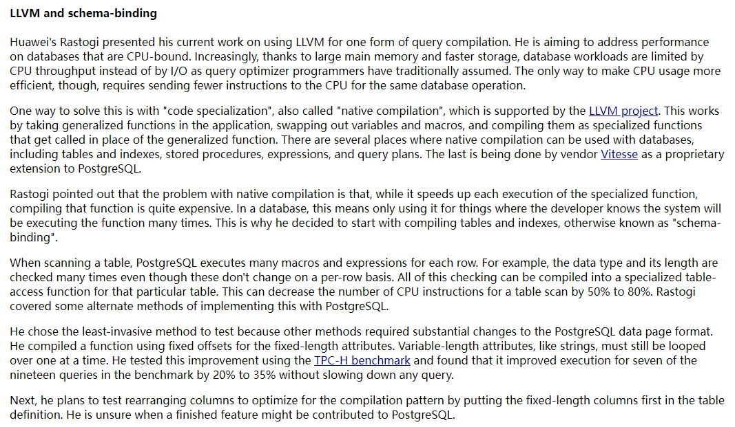 找对场景,一样有收益。比如根据ISPRAS 2017年发表的实验结果(jit-compiling sql queries in postgresql using llvm)可知:pgbench测试下,OLTP场景中简单的查询加上JIT(Just-in-time及时编译,LLVM天然支持)扩展没有带来性能的提升,甚至将TPS(事务数/秒)从21.8降低到了7.8。