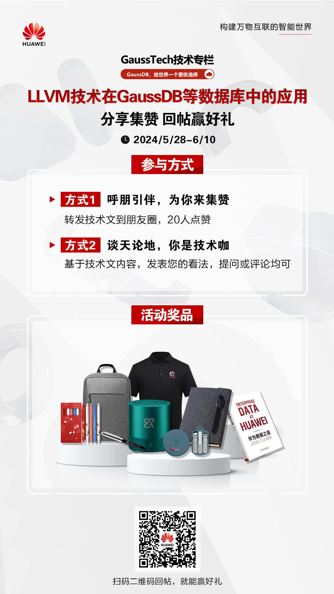 “【分享集赞回帖赢好礼】LLVM技术在GaussDB等数据库中的应用”活动来啦!参与就有机会赢取华为背包、华为云定制短袖、蓝牙音箱、书籍等好礼!