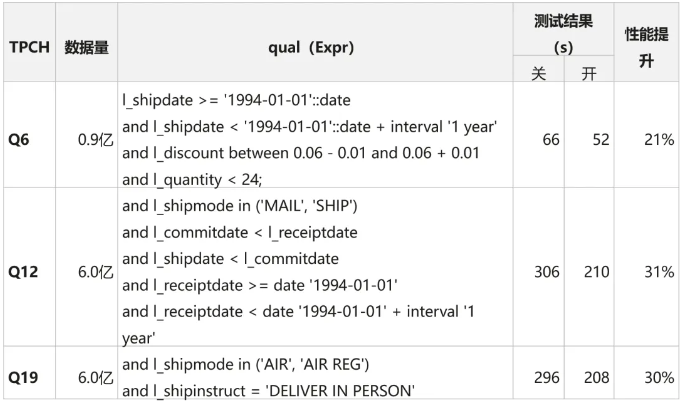 测试结果显示,打开codegen时,带有qual的SQL,查询性能都有明显提升,且提升比例与qual在整个SQL中的占比相关,像Q6、Q12、Q19等qual占比较高的查询,性能提升也较多。