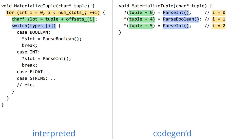 元组拆解是把一个磁盘上的元组转换成其在内存中表示的过程。通过创建一个专门针对该表布局和要被抽取的列数的函数来实现加速。