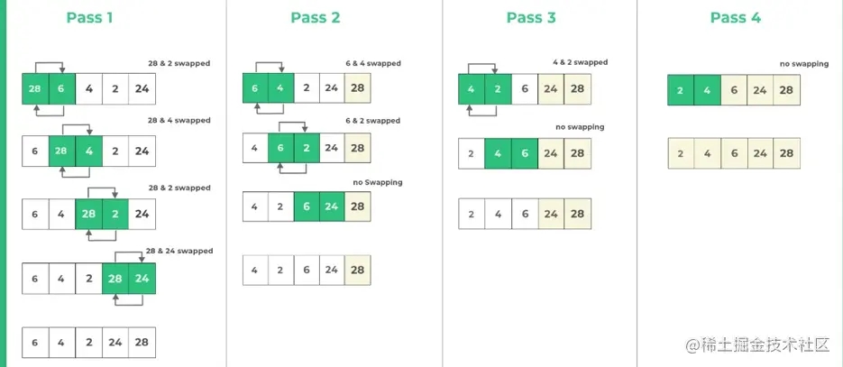 - 每轮比较结束后,需要排序的元素数量减一,直到没有需要排序的元素。