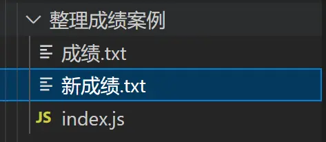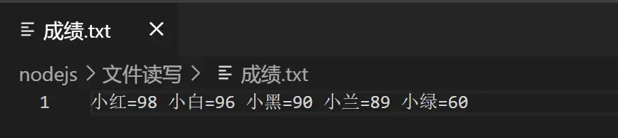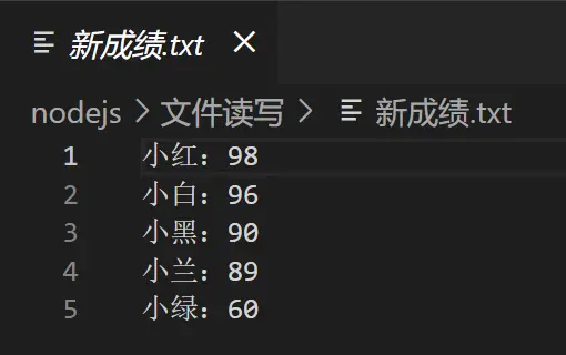 // 导入文件操作模块 const fs = require("fs"); // 读取 fs.readFile("./成绩.txt", "utf8", (error, dataStr) => { if (error) return console.log("文件读取失败", error.message); const oldArray = dataStr.split(" "); //[小红=80,小兰=60] let newArray = oldArray.map((item) => item.replace("=", ":")); //[小红:80,小兰:60] let newStr = newArray.join("\r\n"); fs.writeFile("./新成绩.txt", newStr, "utf8", (error) => { if (error) return console.log("文件写入失败", error); console.log("文件写入成功!!"); }); });