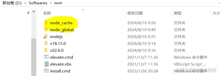 5.在nvm安装路径中创建两个文件夹(node_cache, node_global):