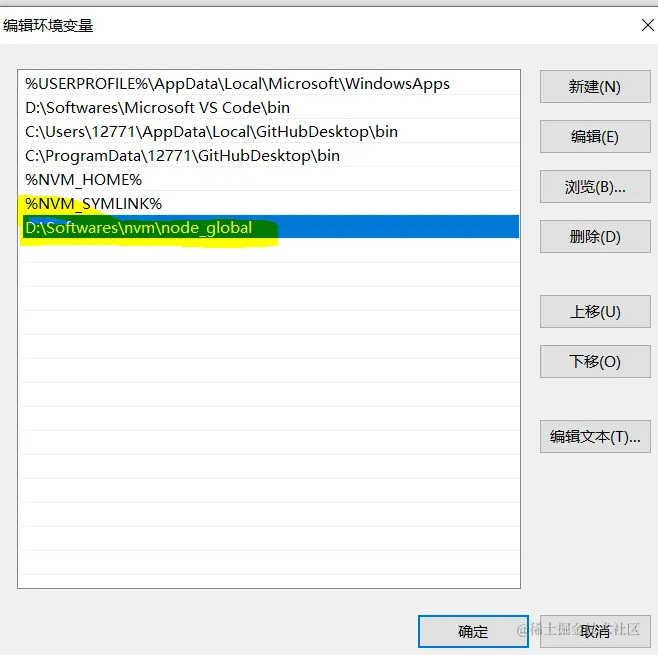 在环境变量Path中添加:D:\Softwares\nvm\node_global,系统变量和环境变量都要有