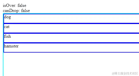 // ListItem.tsx // 将list item也变成droppable const [spec, dropRef] = useDrop({ accept: 'listItem', hover: (item, monitor) => { const dragIndex = item.index const hoverIndex = index const hoverBoundingRect = ref.current?.getBoundingClientRect() const hoverMiddleY = (hoverBoundingRect.bottom - hoverBoundingRect.top) / 2 const hoverActualY = monitor.getClientOffset().y - hoverBoundingRect.top // 如果是向下拖,只有当hover的坐标小于自身高度的一半时,继续保持drag,否则相当于要挪动其他的list item,给当前的item腾个地方 // if dragging down, continue only when hover is smaller than middle Y if (dragIndex < hoverIndex && hoverActualY < hoverMiddleY) return // 如果是向上拖,只有当hover的坐标大于自身高度的一半时,继续保持drag,否则相当于要挪动其他的list item,给当前的item腾个地方 if (dragIndex > hoverIndex && hoverActualY > hoverMiddleY) return moveListItem(dragIndex, hoverIndex) item.index = hoverIndex }, });