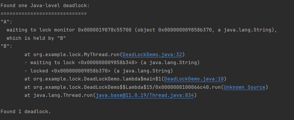 System.out.println(Thread.currentThread().getName()+"lock:"+lockB+"=>get"+lockA);